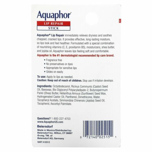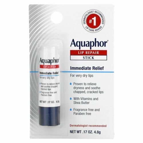 Aquaphorยฎ Lip Repair immediately relieves dryness and soothes chapped, cracked lips. It provides effective, long-lasting moisture, so lips look and feel healthier. Formulated with a special combination of nourishing vitamins (C,E provitamin B5), moisturizers, shea butter, and jojoba oil, Aquaphor leaves lips feeling soft and comfortable.